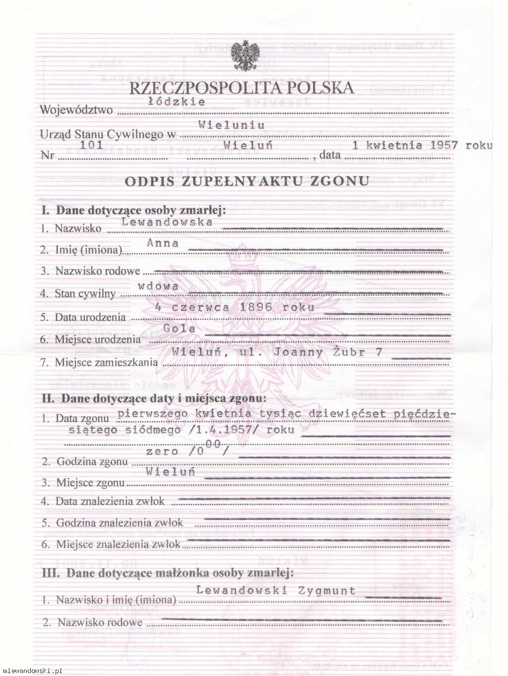 Odpis zupełny aktu zgonu Anny Lewandowskiej