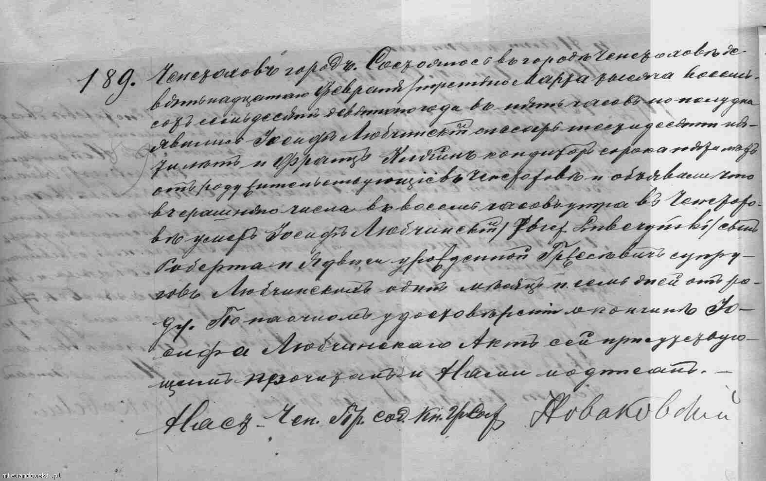 Akt zgonu Józefa Lubczyńskiego (+ 00.00.1879 r. Częstochowa) w języku rosyjskim.