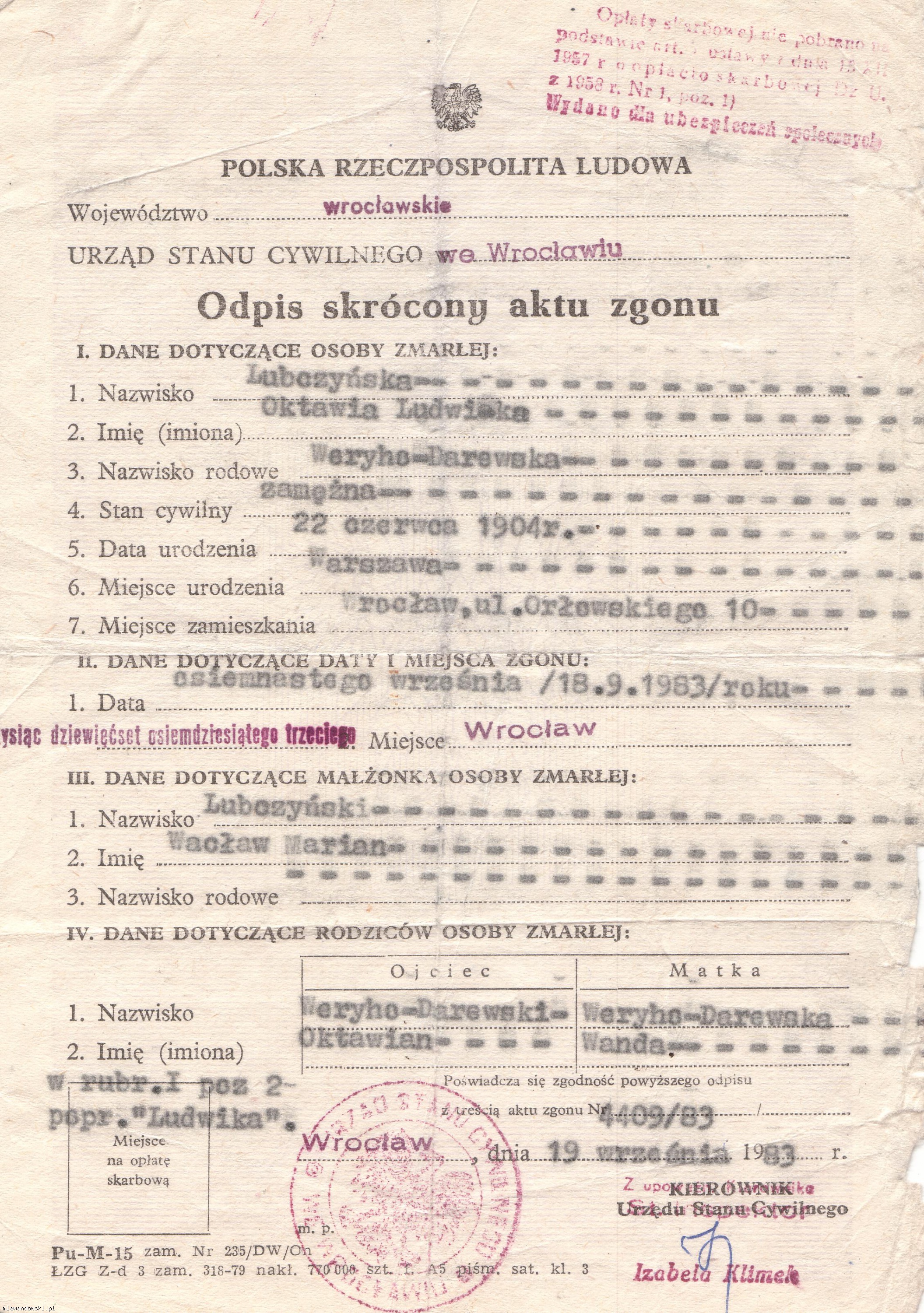 Sporządzono na podstawie zapisów w Urzędzie Stanu Cywilnego we Wrocławiu, księga zgonów nr 4409/83 z dnia 19.09.1983 r.
