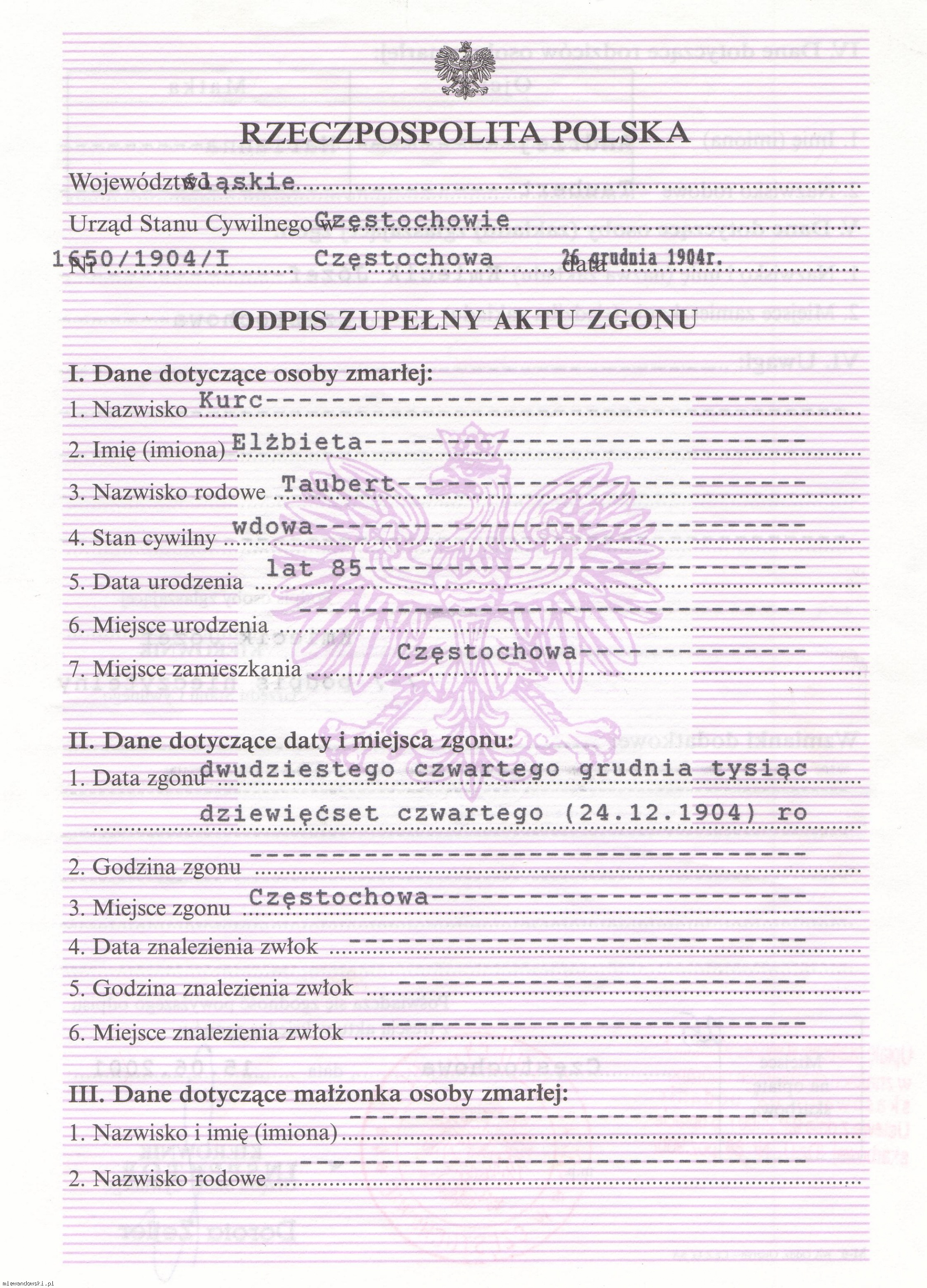 Odpis zupełny aktu zgonu Elżbieta Kurc z Taubertów (+24.12.1904 Częstochowa).