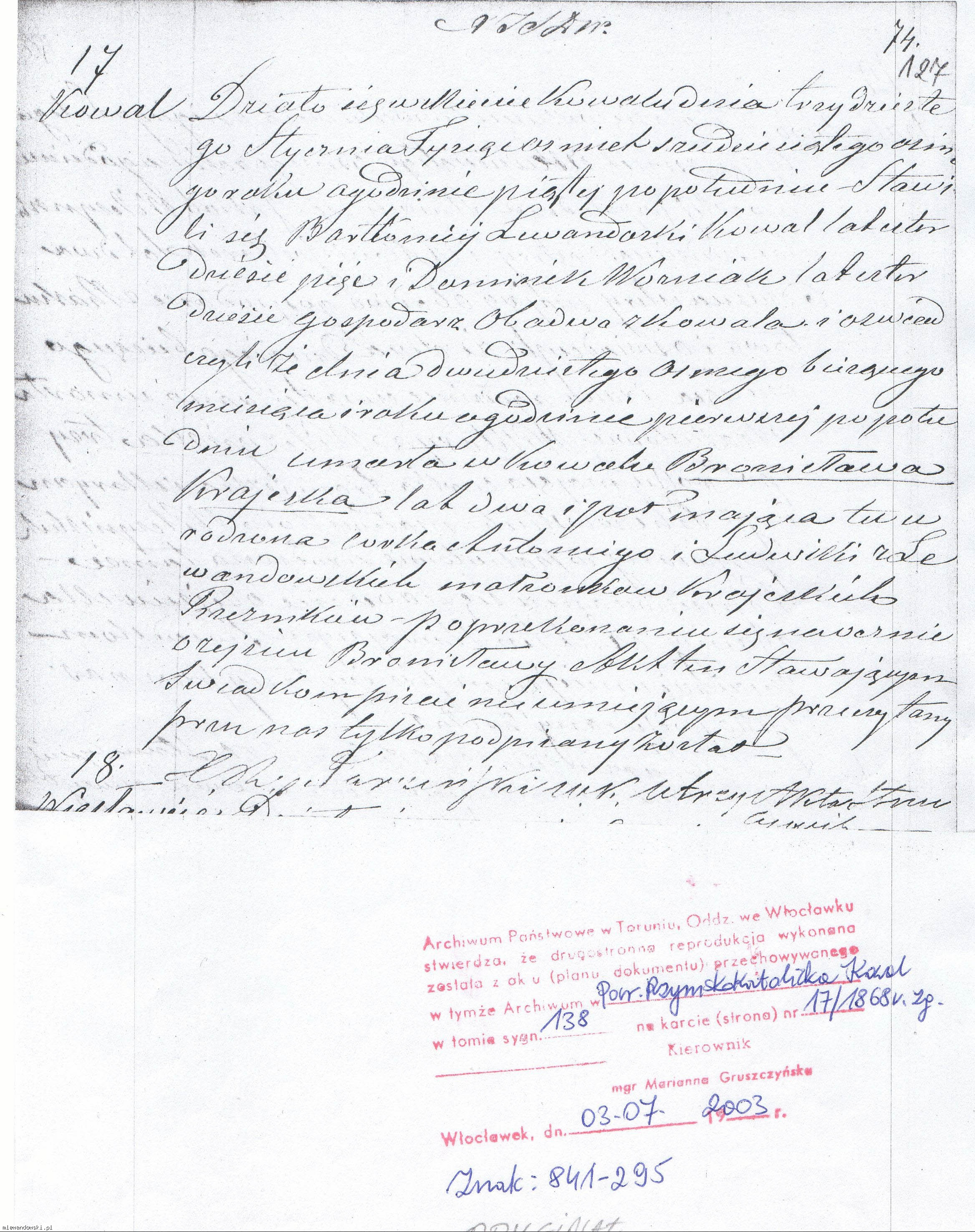 Oryginał aktu przechowywany jest w Archiwum Państwowym w Toruniu Oddział we Włocławku w dokumentach USC parafii Rzymsko-Katolickiej pw. św. Urszuli w Kowalu w tomie sygn. 138 nr aktu 17 z 1868 roku.