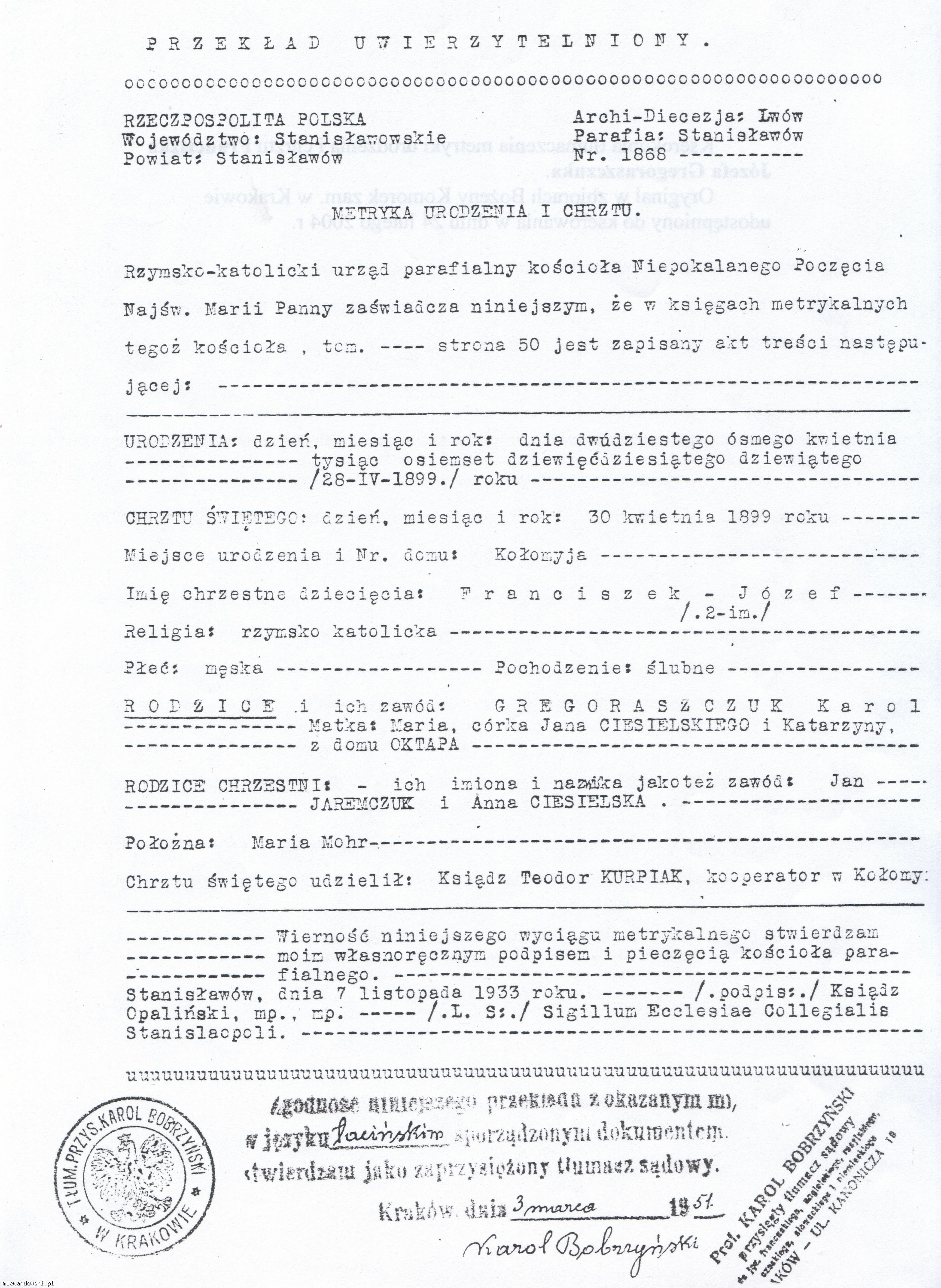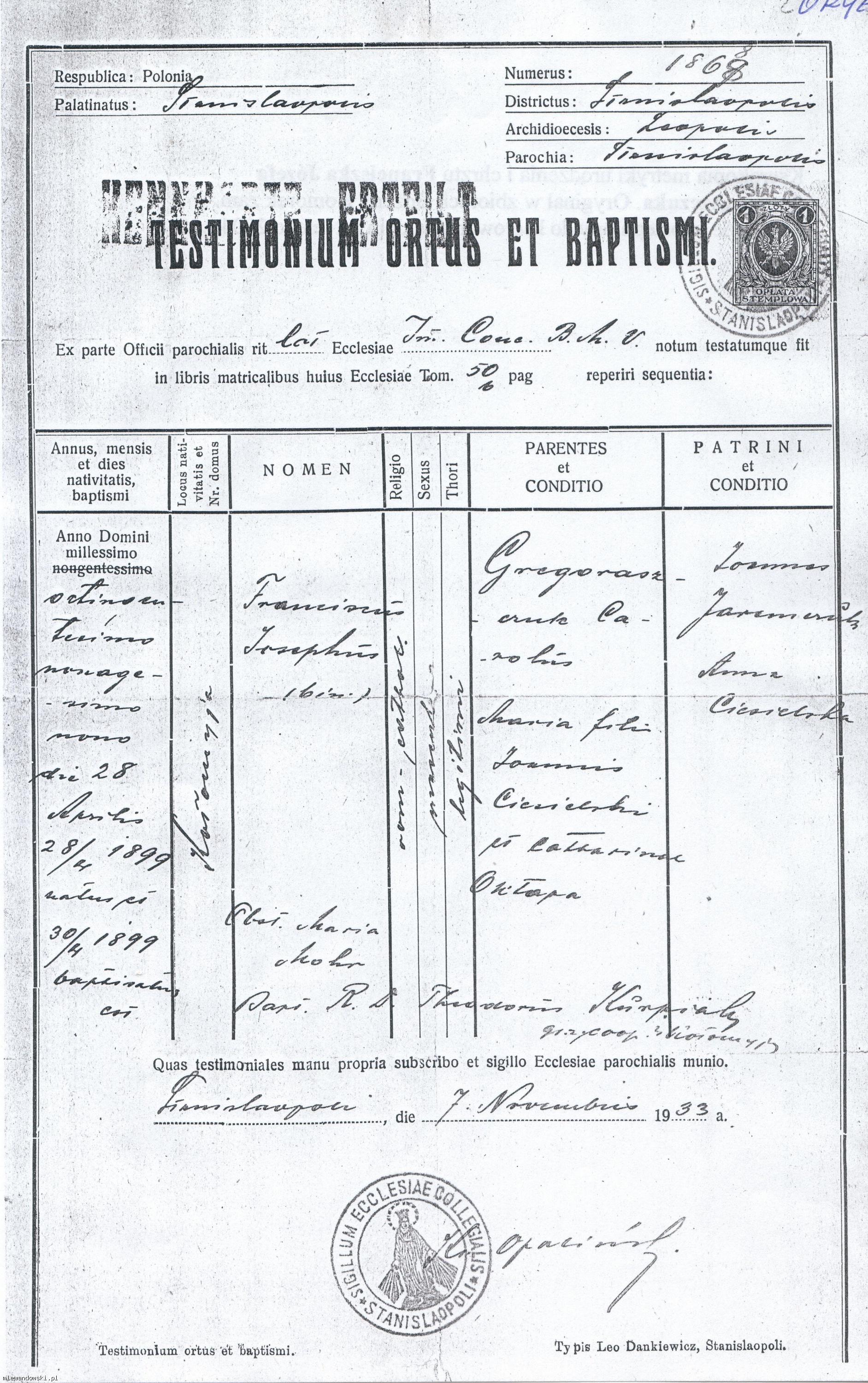 Akt urodzenia i chrztu Franciszek Józefa Gregoraszczuk (* 30.04.1899 r. Kołomyja)