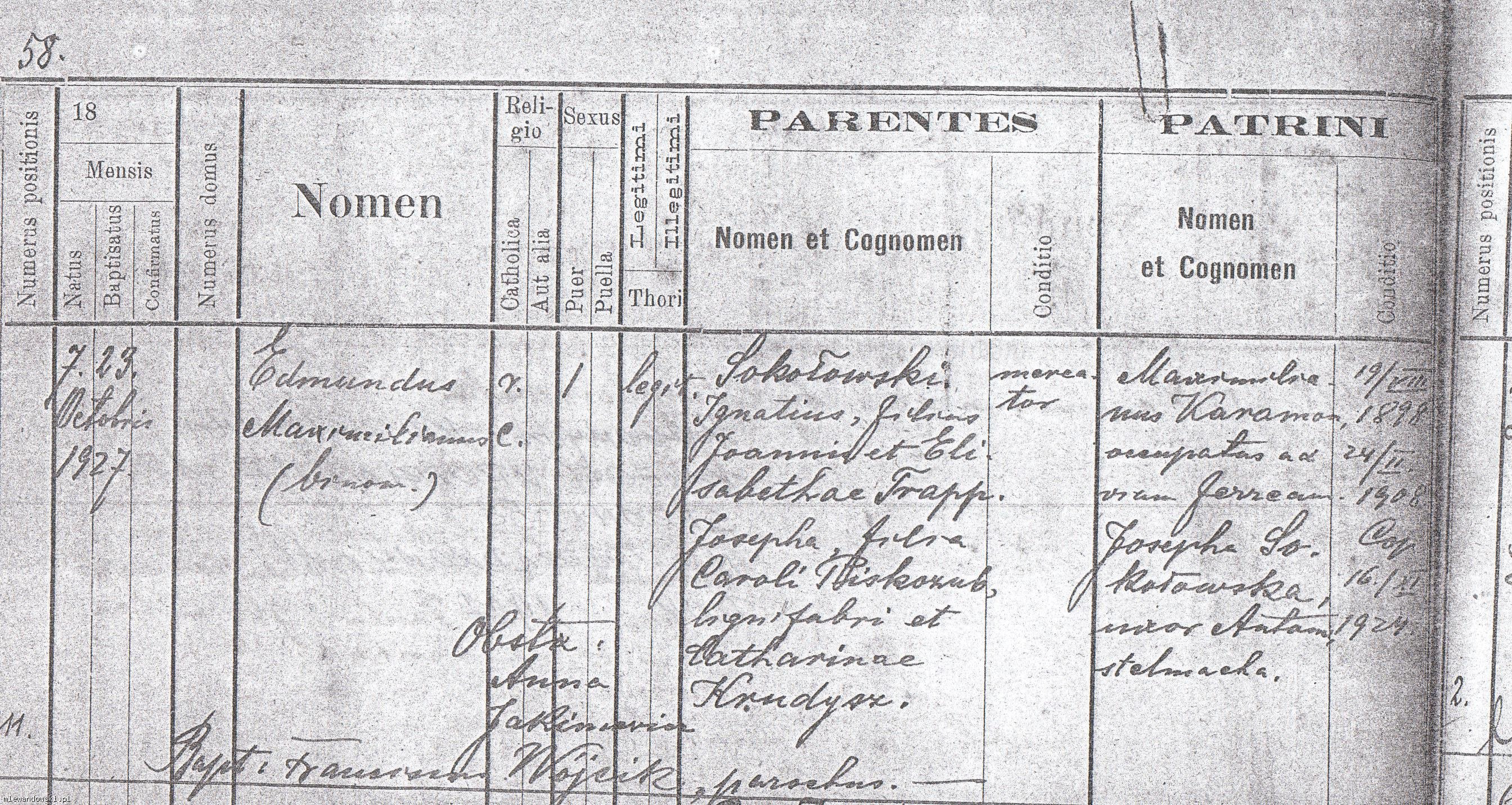 Akt urodzenia i chrztu Edmund Maximilian Sokołowski (* 07.10.1927r. Kołomyja)