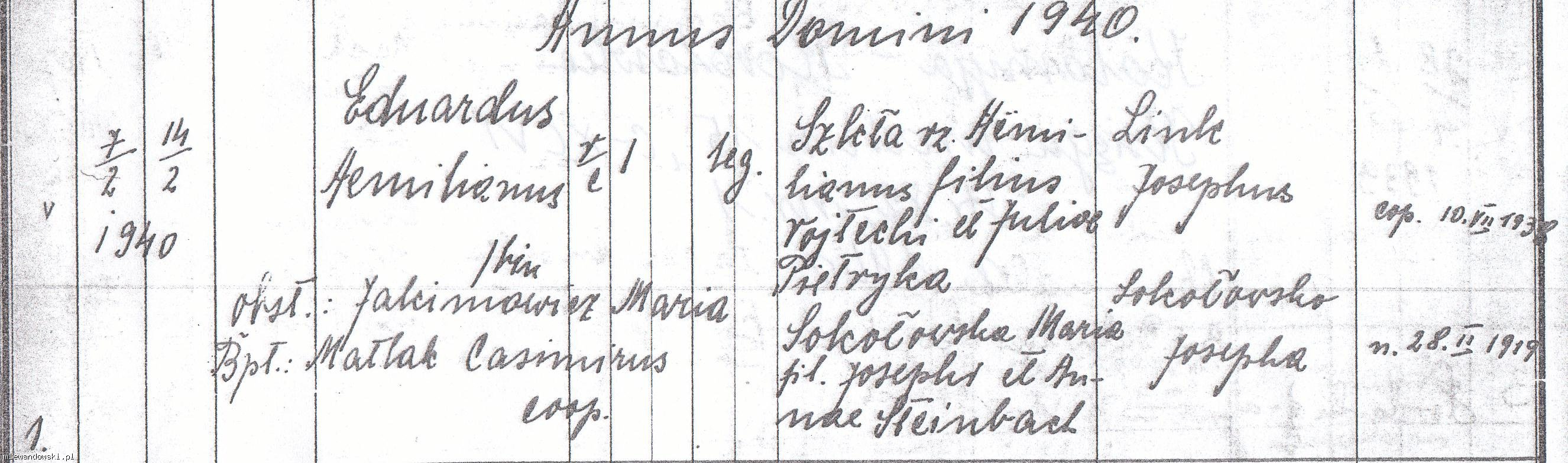 1940 r. Akt urodzenia i chrztu Edward Emilian Szklarz (*11.02.1940 r. Kołomyja)
