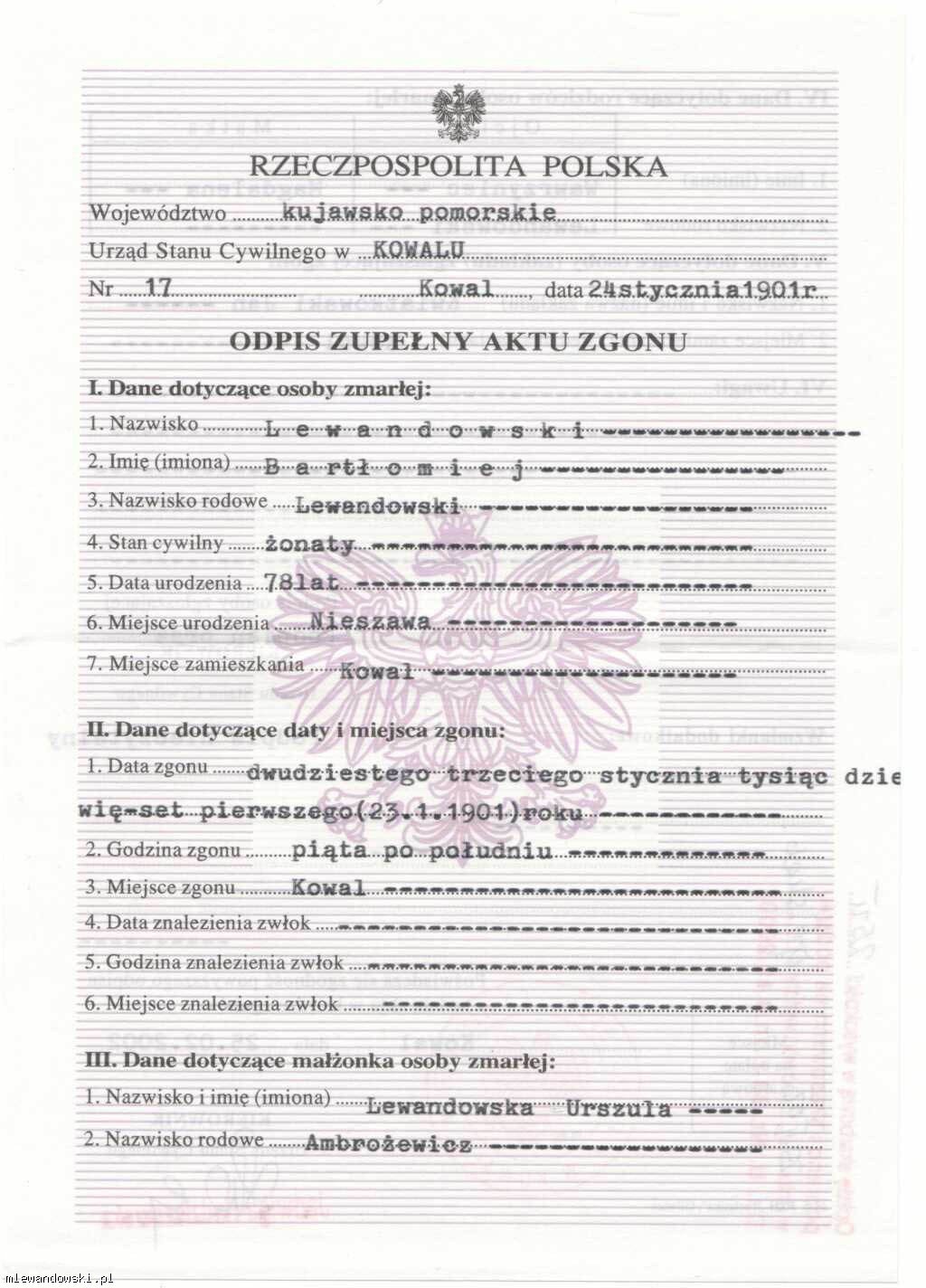 Odpis zupełny aktu zgonu Bartłomiej Lewandowski.