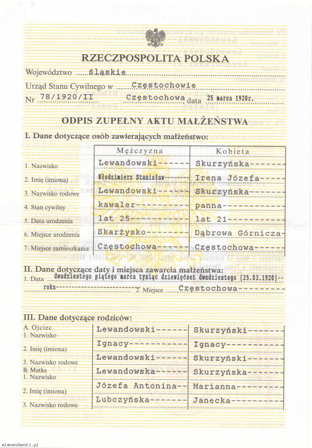 Odpis zupełny aktu małżeństwa Włodzimierz Stanisław Lewandowski i Irena Józefa Skurzyńska.
