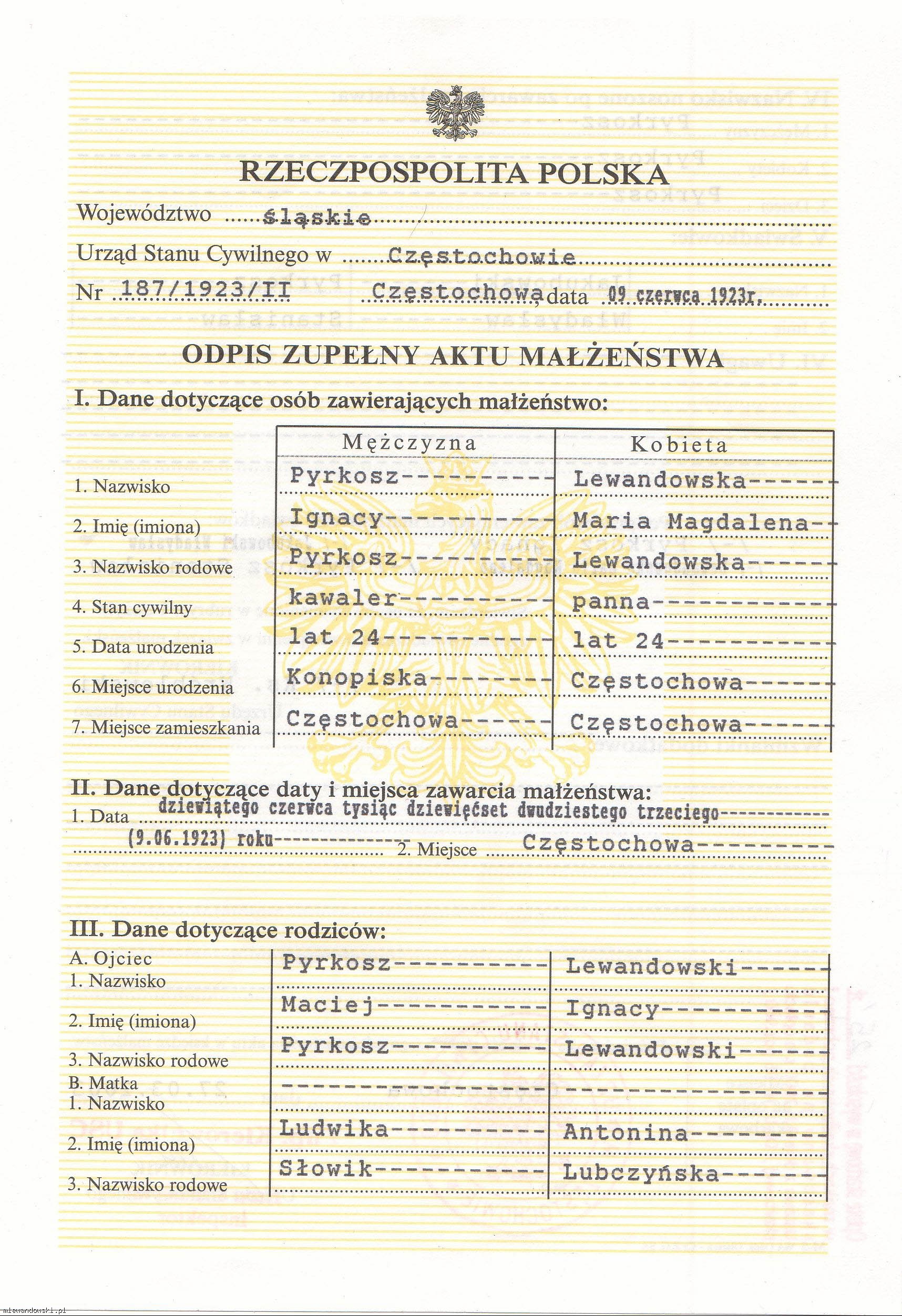 Odpis zupełny aktu małżeństwa Ignacy Pyrkosz i Maria Magdalena Lewandowska.