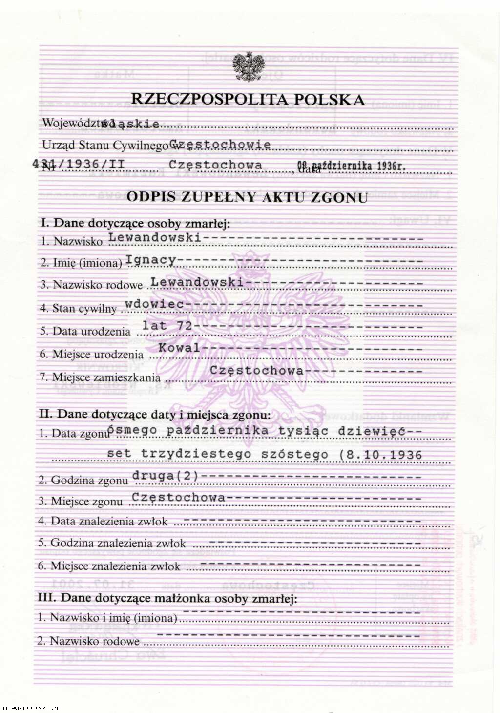 Odpis zupełny aktu zgonu Ignacy Lewandowski.
