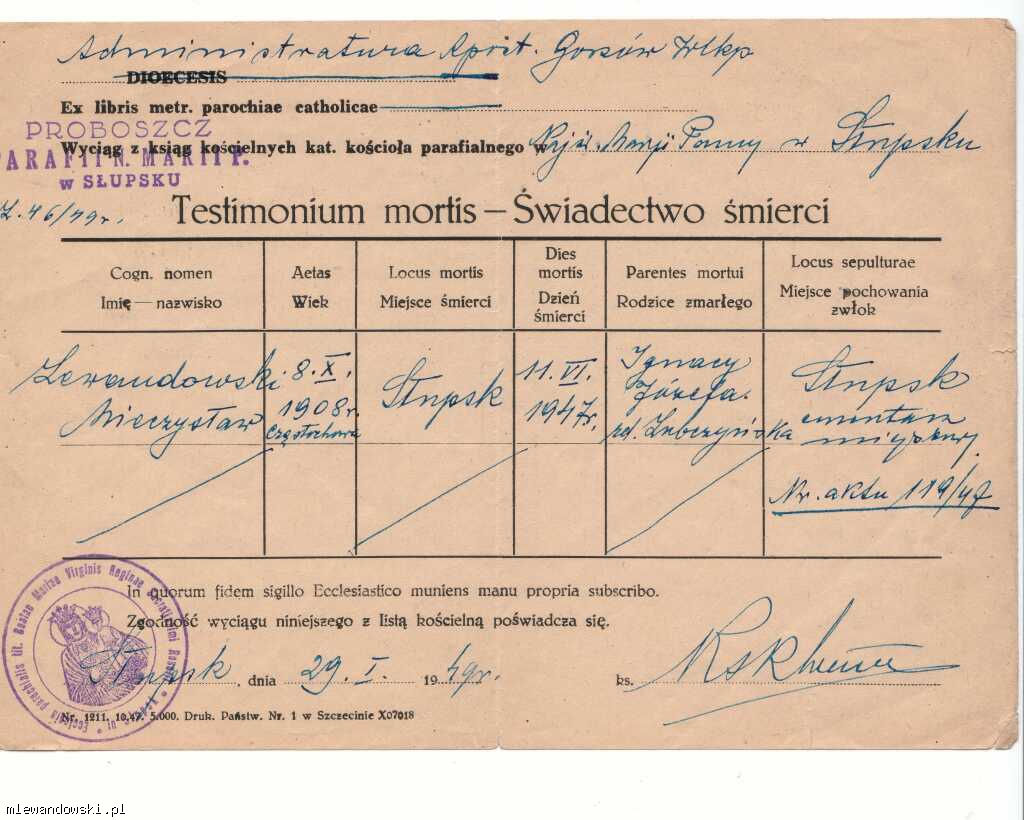 Sporządzony przez Proboszcza Parafii N. Marii P. w Słupsku w dniu 29.01.1949 r.